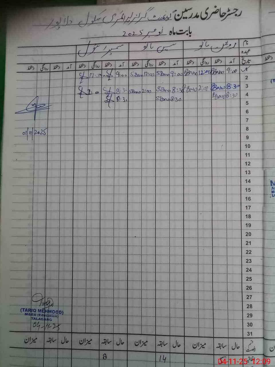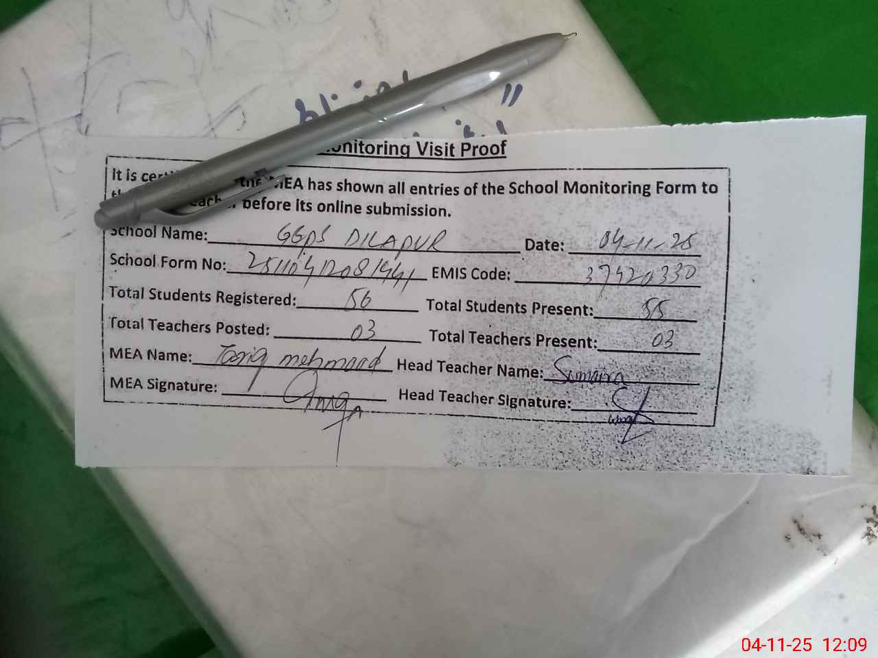 | Attendance Register | Head Teacher | MEA with School | Visit Proof |
