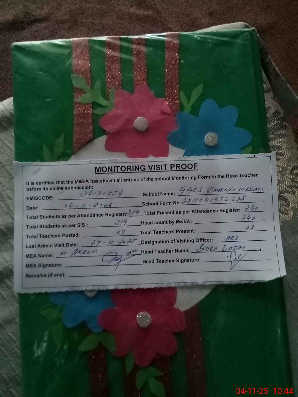 | Attendance Register | Head Teacher | MEA with School | Visit Proof |