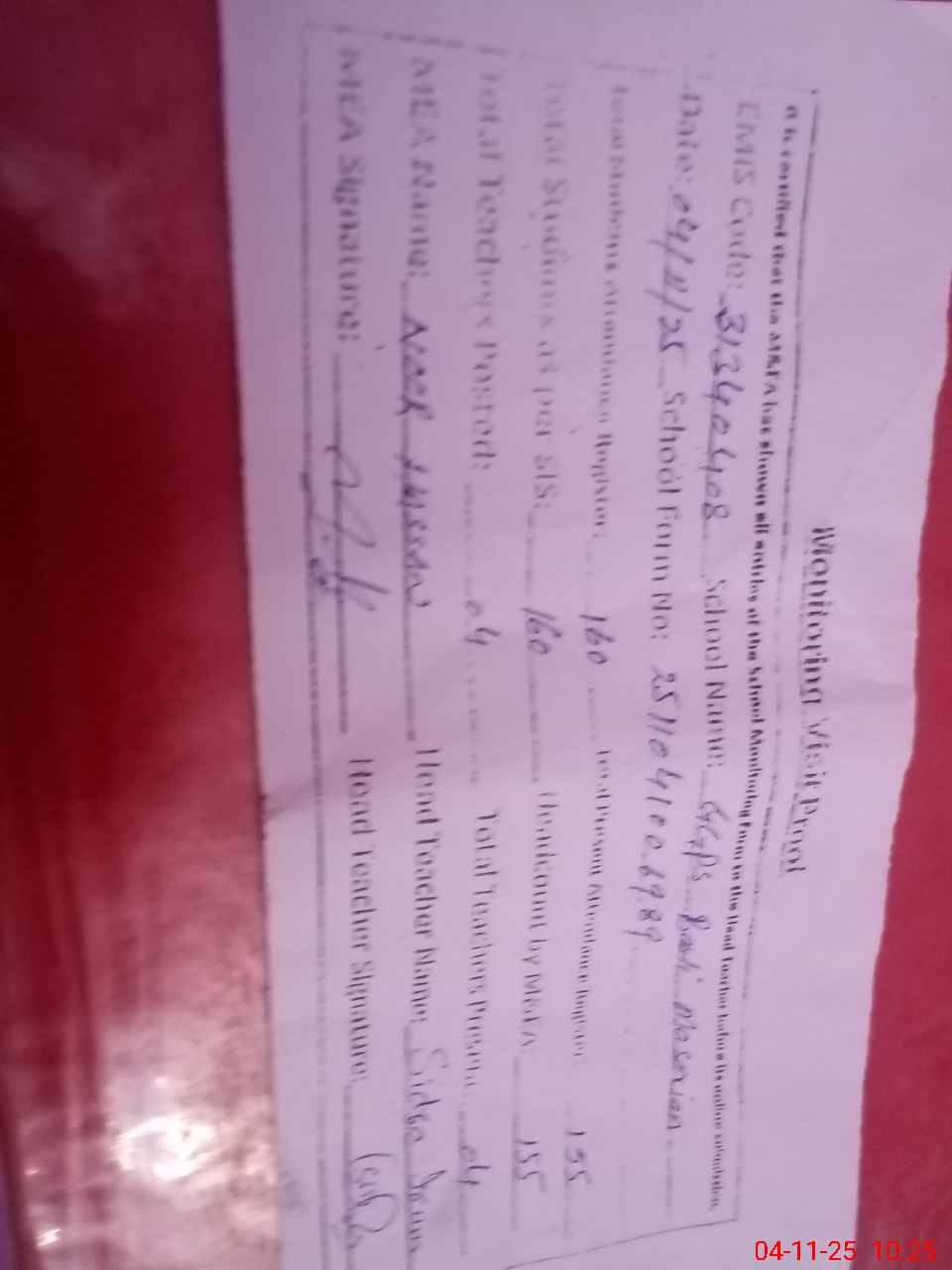| Attendance Register | Head Teacher | MEA with School | Visit Proof |
