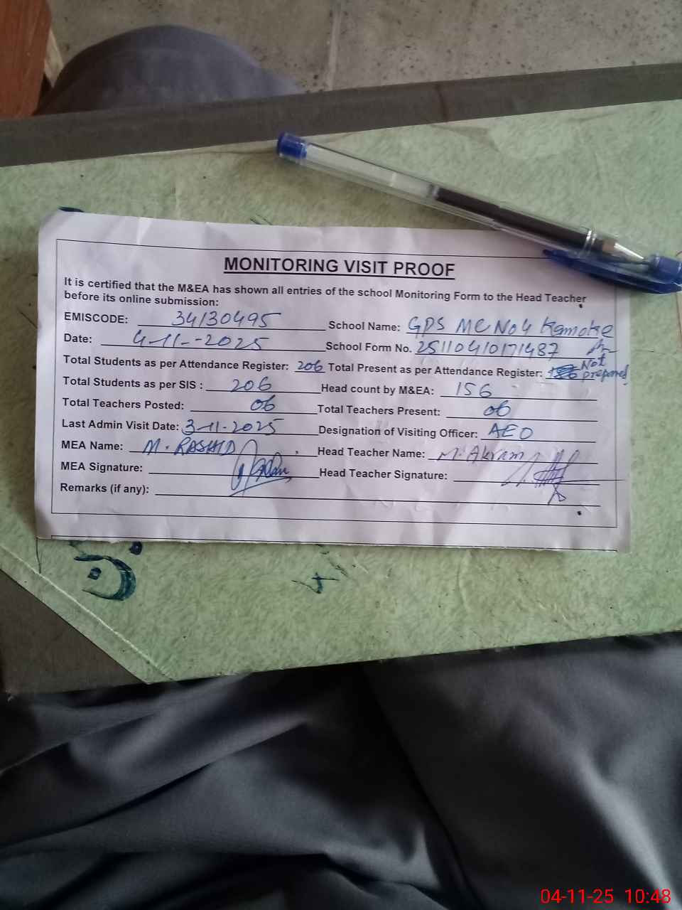 | EMIS Code: 34130495 | Name of School: GPS MC NO.04 KAMOKE | |||