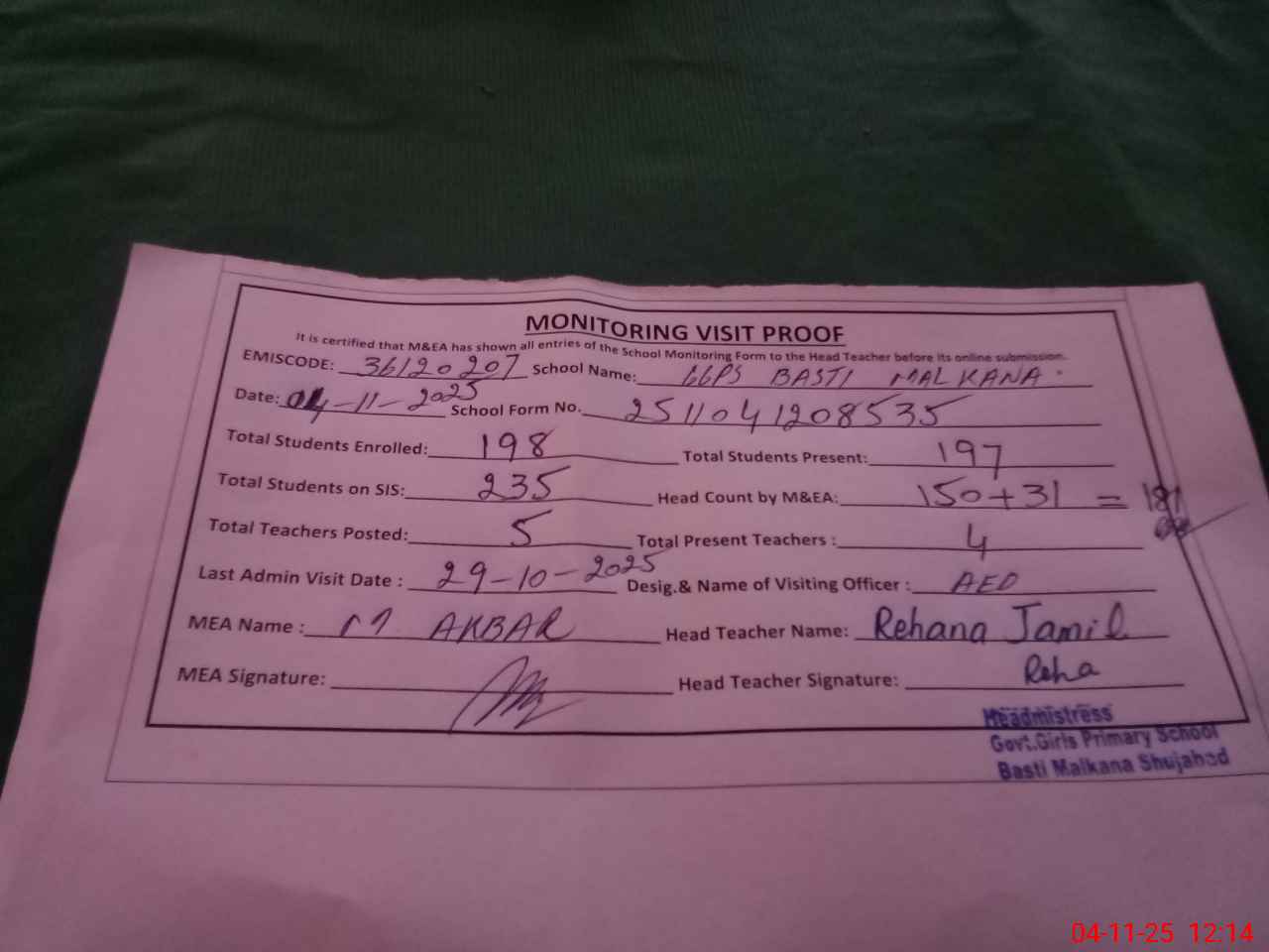 | Attendance Register | Head Teacher | MEA with School | Visit Proof |