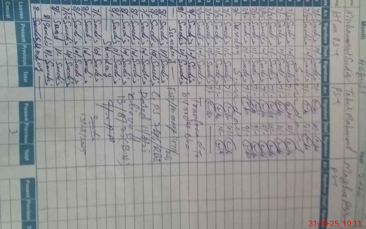 | CNIC | Full Name | Designation | R/C | Absence During Last Calender Month |