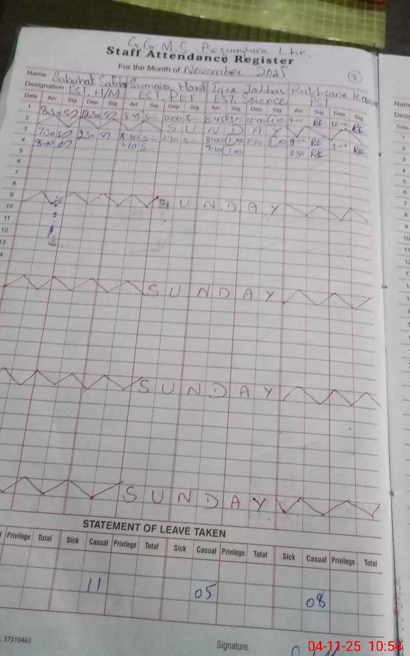 | CNIC | Full Name | Designation | R/C | Absence During Last Calender Month |