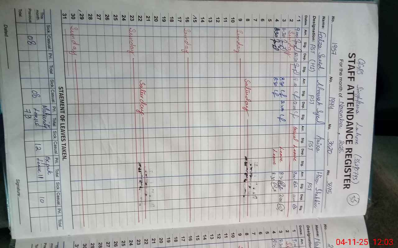| Remarks (Use Separate Page if Required): Teacher Aaiza PST on casual leave but her casual leave was not available on line or manual so according to monitoring sop mark her Absent SG Hassan Tazeem present as per attendance regist but he was not physically present in school so according to monitoring sop mark him Absent today Students attendance 75 percent after head count | |||||