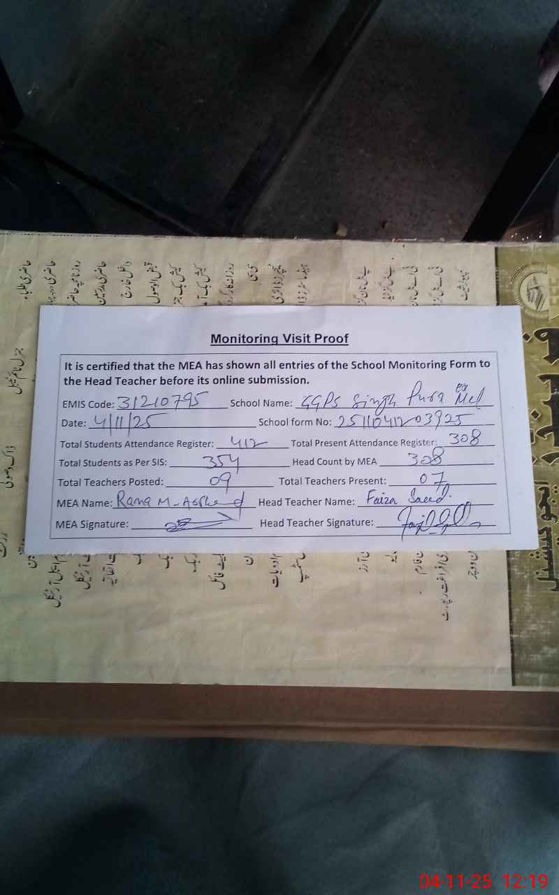 | Attendance Register | Head Teacher | MEA with School | Visit Proof |