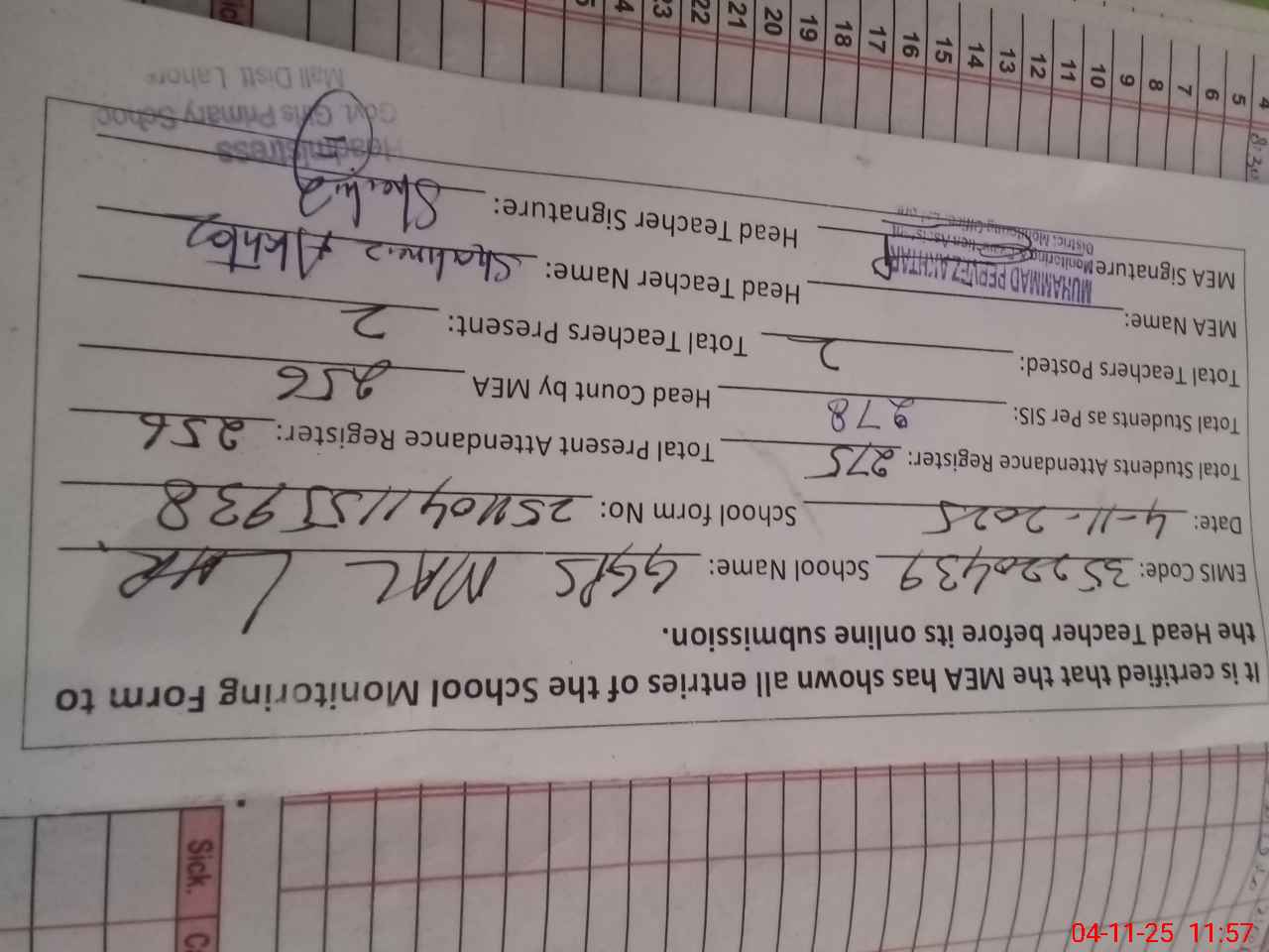 | Name: SH**** AK**** Designation: (School Headmaster's/Headmistress's) Head Mistress Phone/Cell Number: 03**** |