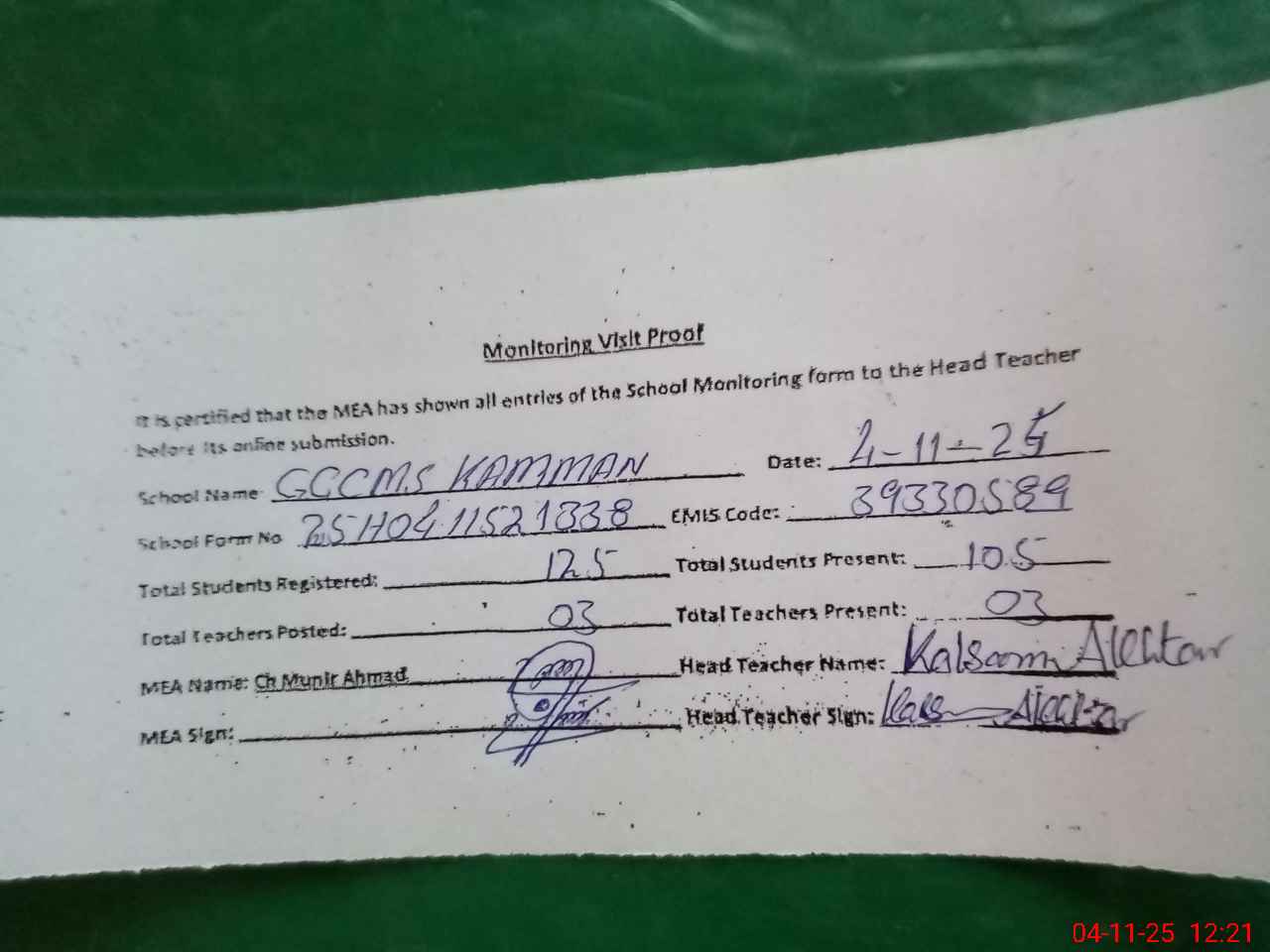 | Attendance Register | Head Teacher | MEA with School | Visit Proof |