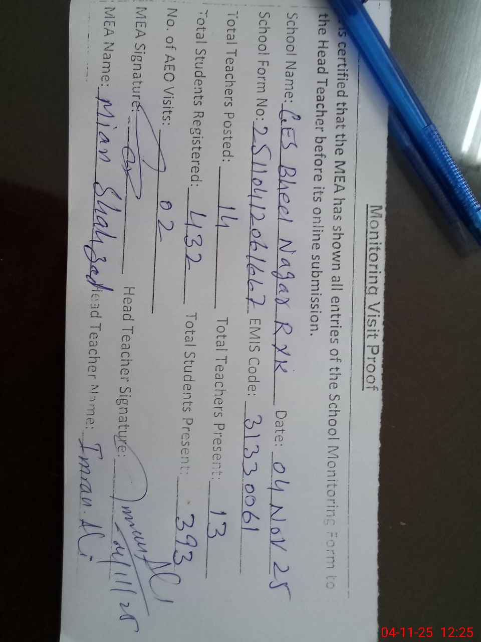 | Attendance Register | Head Teacher | MEA with School | Visit Proof |
