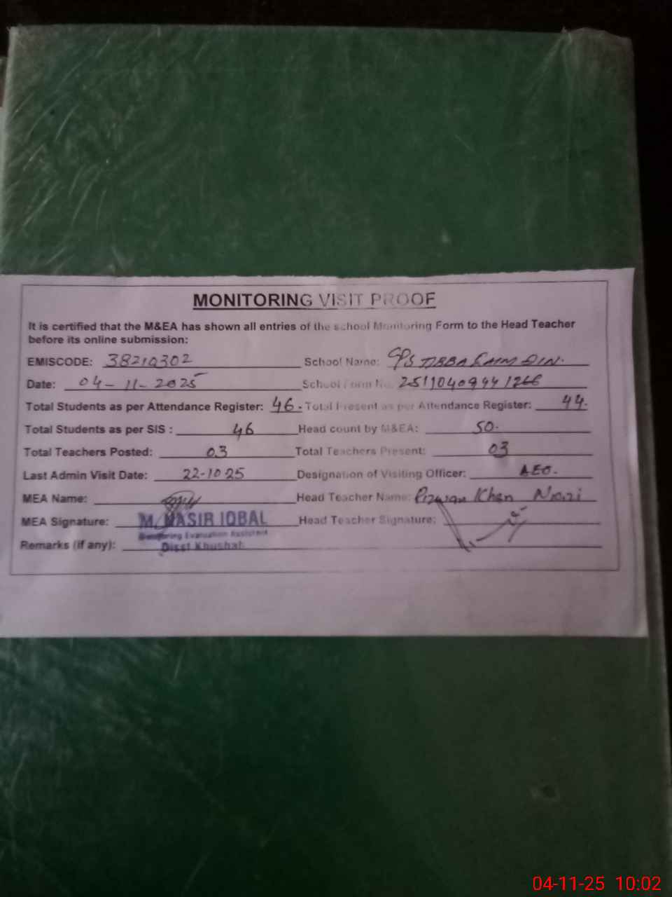 | Remarks (Use Separate Page if Required): Sis students 46 last visit of visiting officer 22 10 2025 by Aeo | |||||