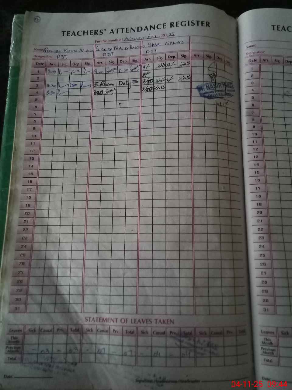 | Leave | Duty | Absent | Maternity | Medical | Ex- Pak |