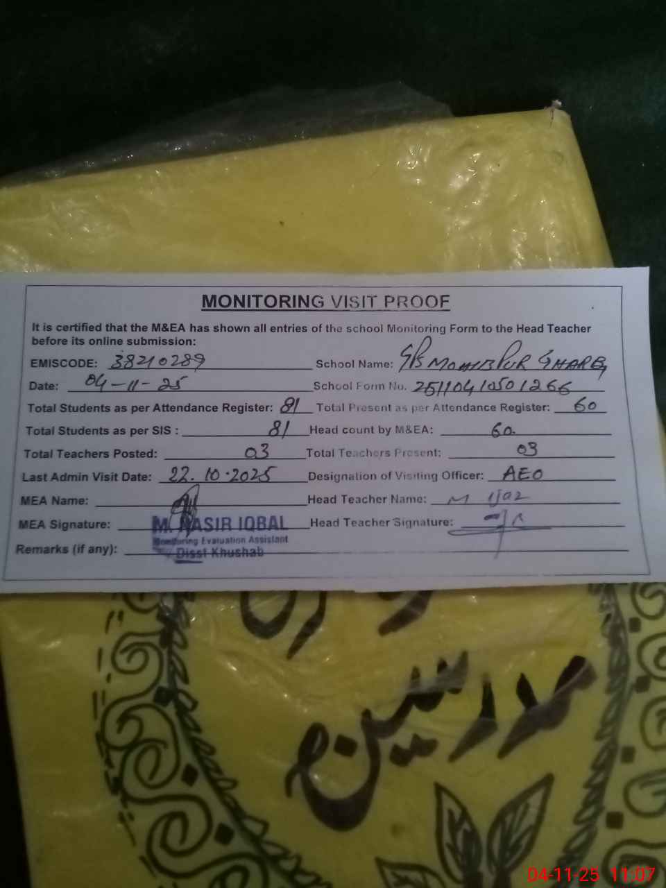 | Attendance Register | Head Teacher | MEA with School | Visit Proof |
