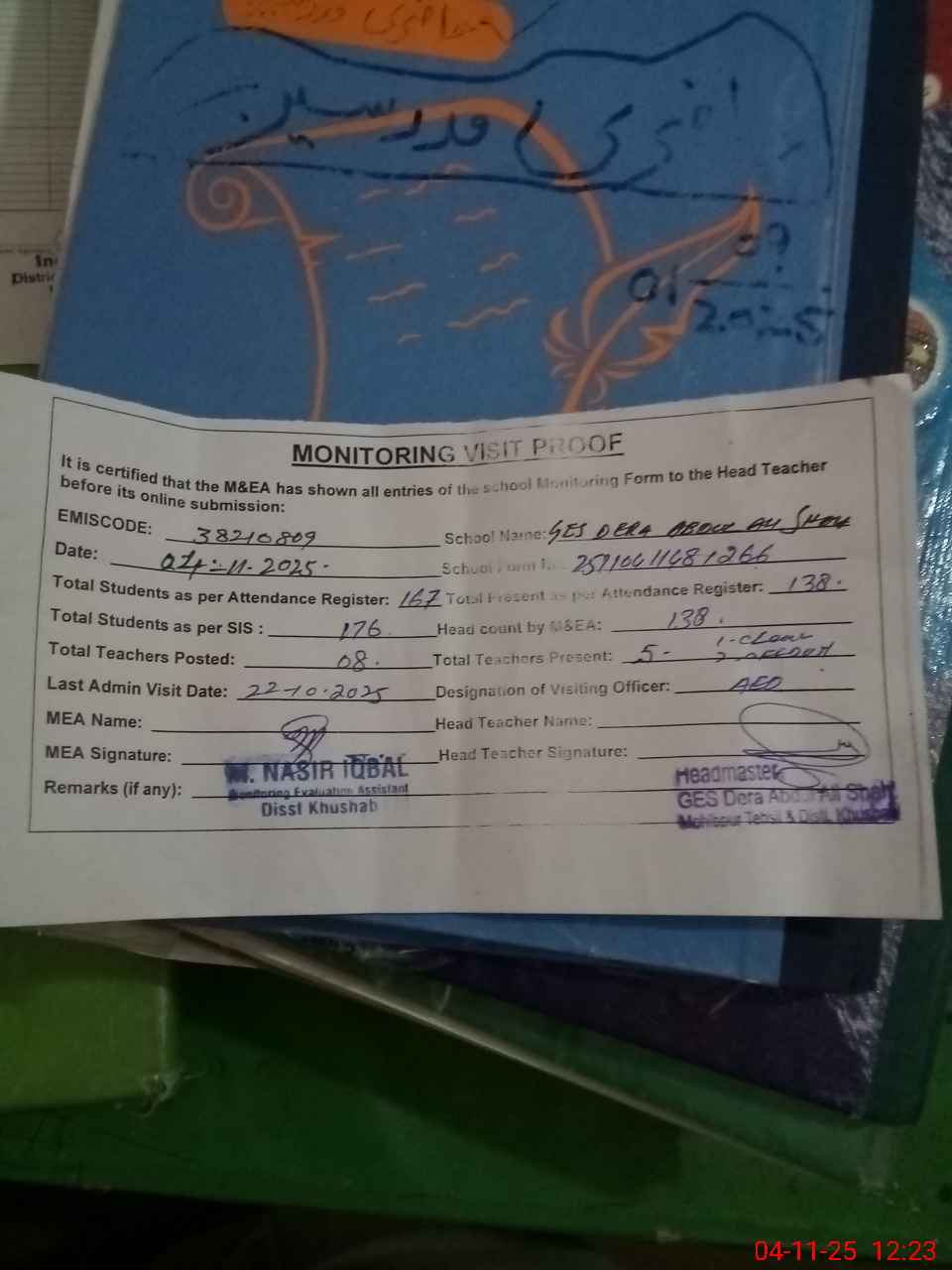 | Attendance Register | Head Teacher | MEA with School | Visit Proof |