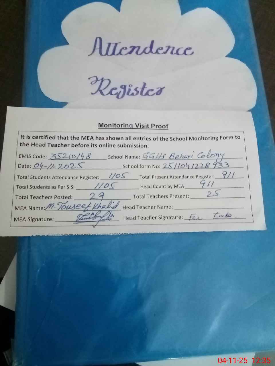 | Attendance Register | Head Teacher | MEA with School | Visit Proof |