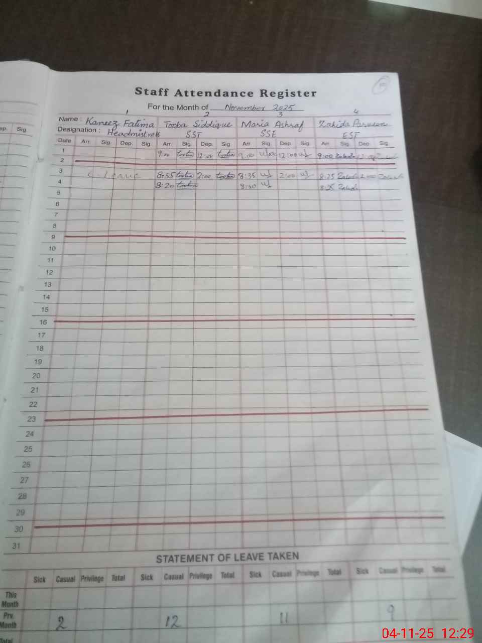 | Remarks (Use Separate Page if Required): The headmistress of this school was absent today and her attendance register column was also blank so I marked him absent moreover in the month of October headmistress was on exam duty NSB record register was maintain with led pencil AEO Shumaila visit this school on 31st October 2025 | |||||