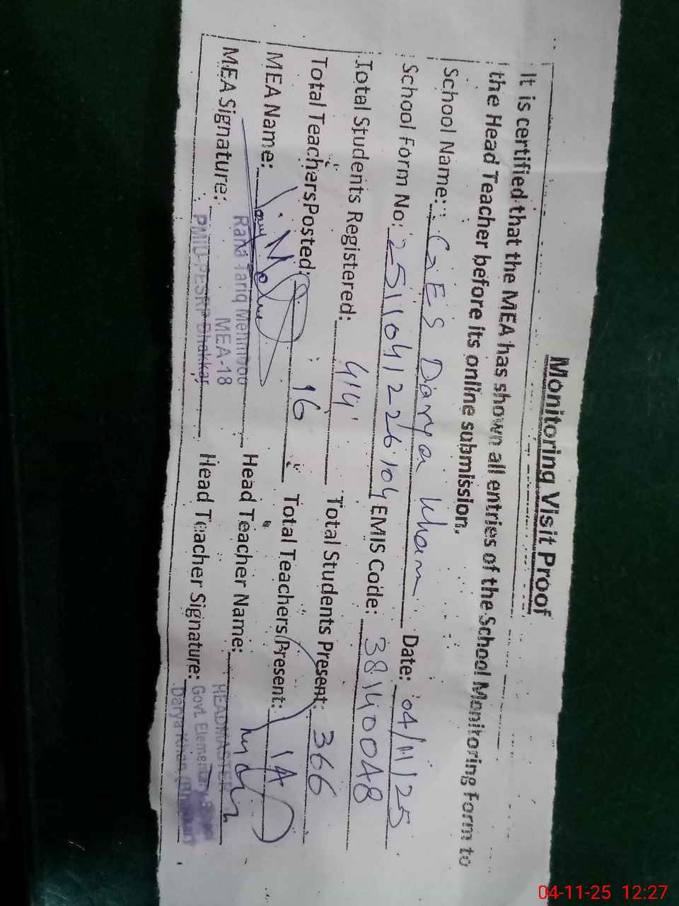 | Remarks (Use Separate Page if Required): Last visit of education authority 1 Designation AEO 2 NAME OF OFFICER KHALID HANIF 3 DATE OF VISIT 04 NOV 2025 Mr Nayyar abbas Shahzad Mali of this school is on duty at Banazir income support programm office Darya khan vide Office of Assistant Comissionar Darya kgan Letter No 1898 AC HC Dated 29 Sep 2025 | |||||
