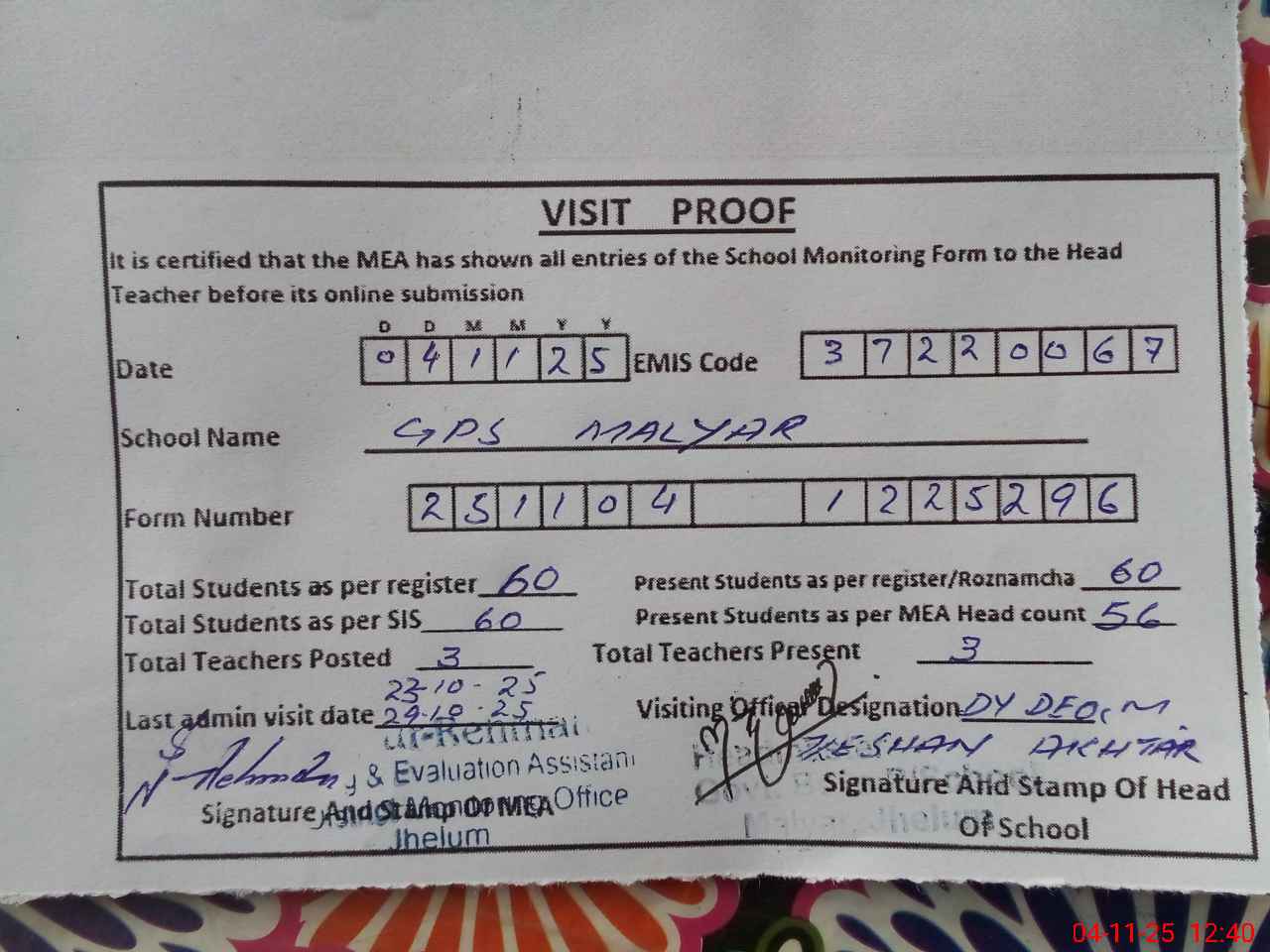 | Attendance Register | Head Teacher | MEA with School | Visit Proof |