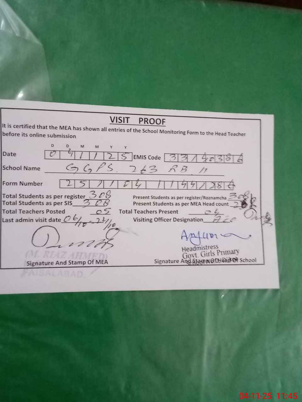 | Attendance Register | Head Teacher | MEA with School | Visit Proof |