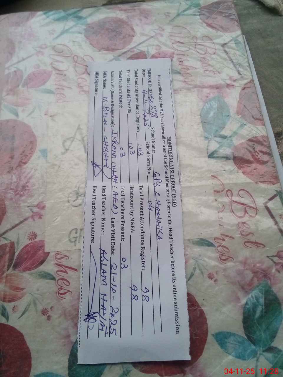 | Attendance Register | Head Teacher | MEA with School | Visit Proof |