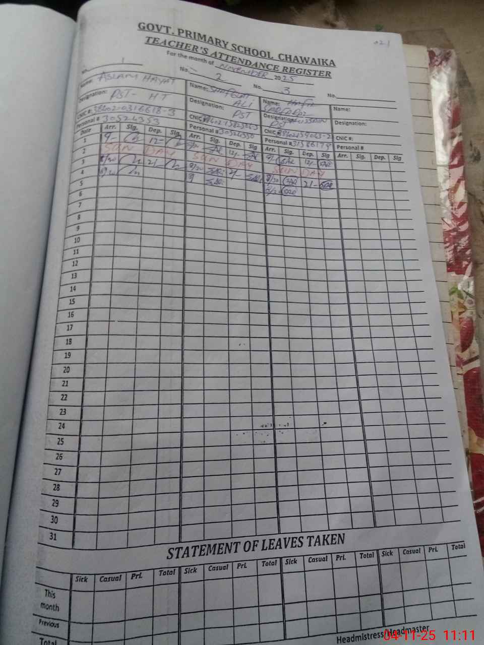 | CNIC | Full Name | Designation | R/C | Absence during last cal. month |