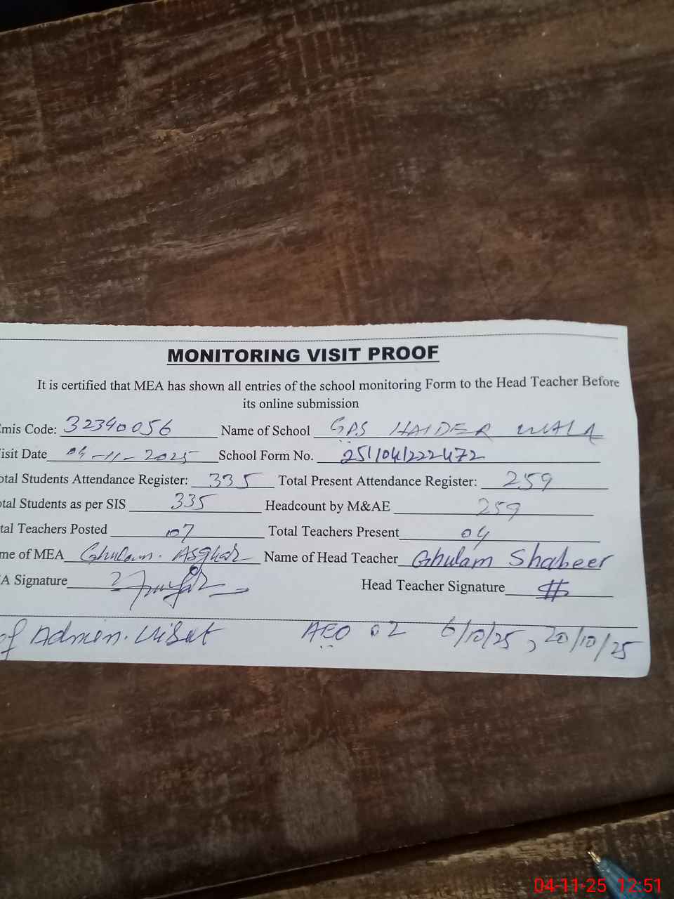 | Attendance Register | Head Teacher | MEA with School | Visit Proof |