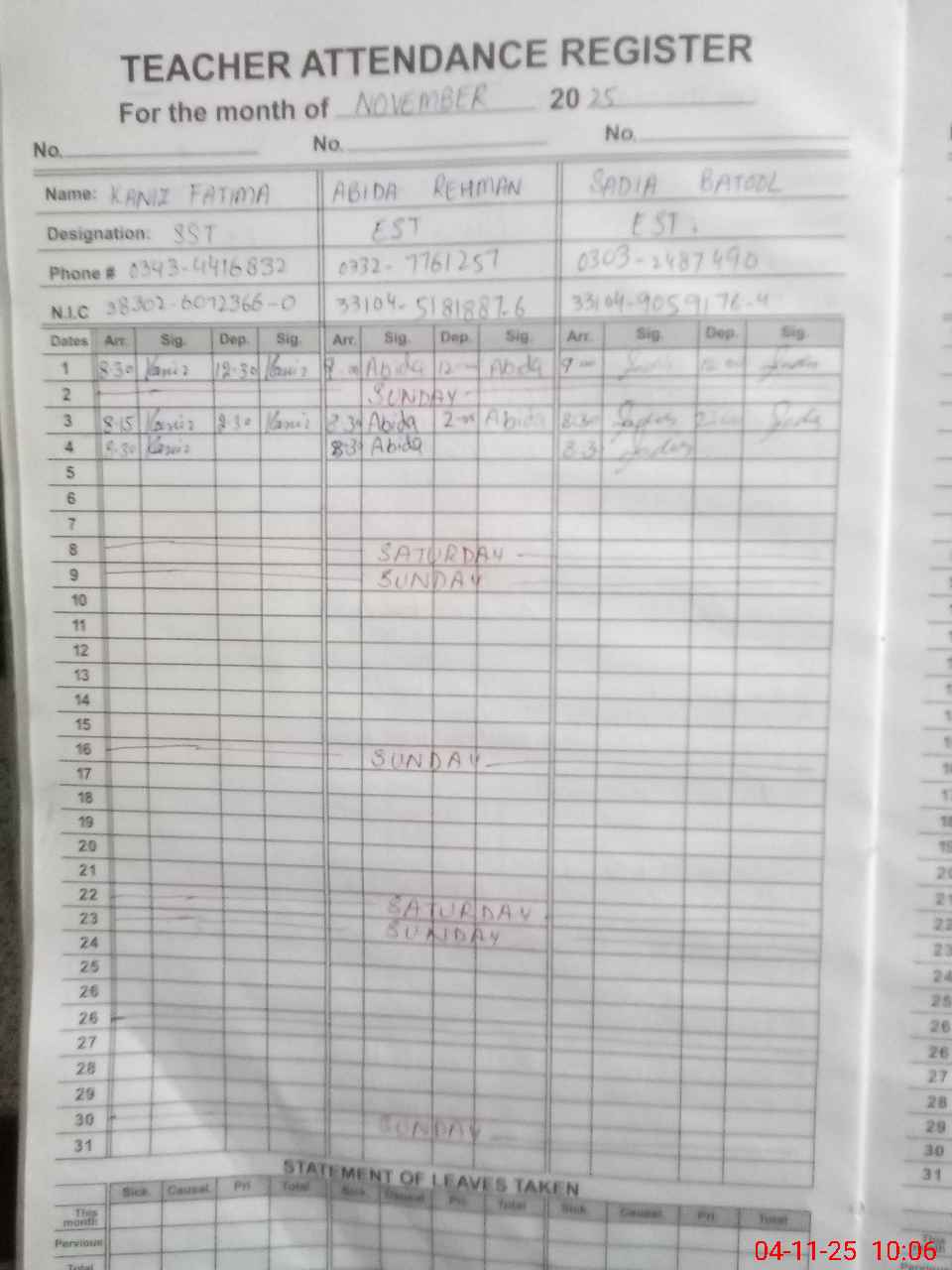 | CNIC | Full Name | Designation | R/C | Absence During Last Calender Month |