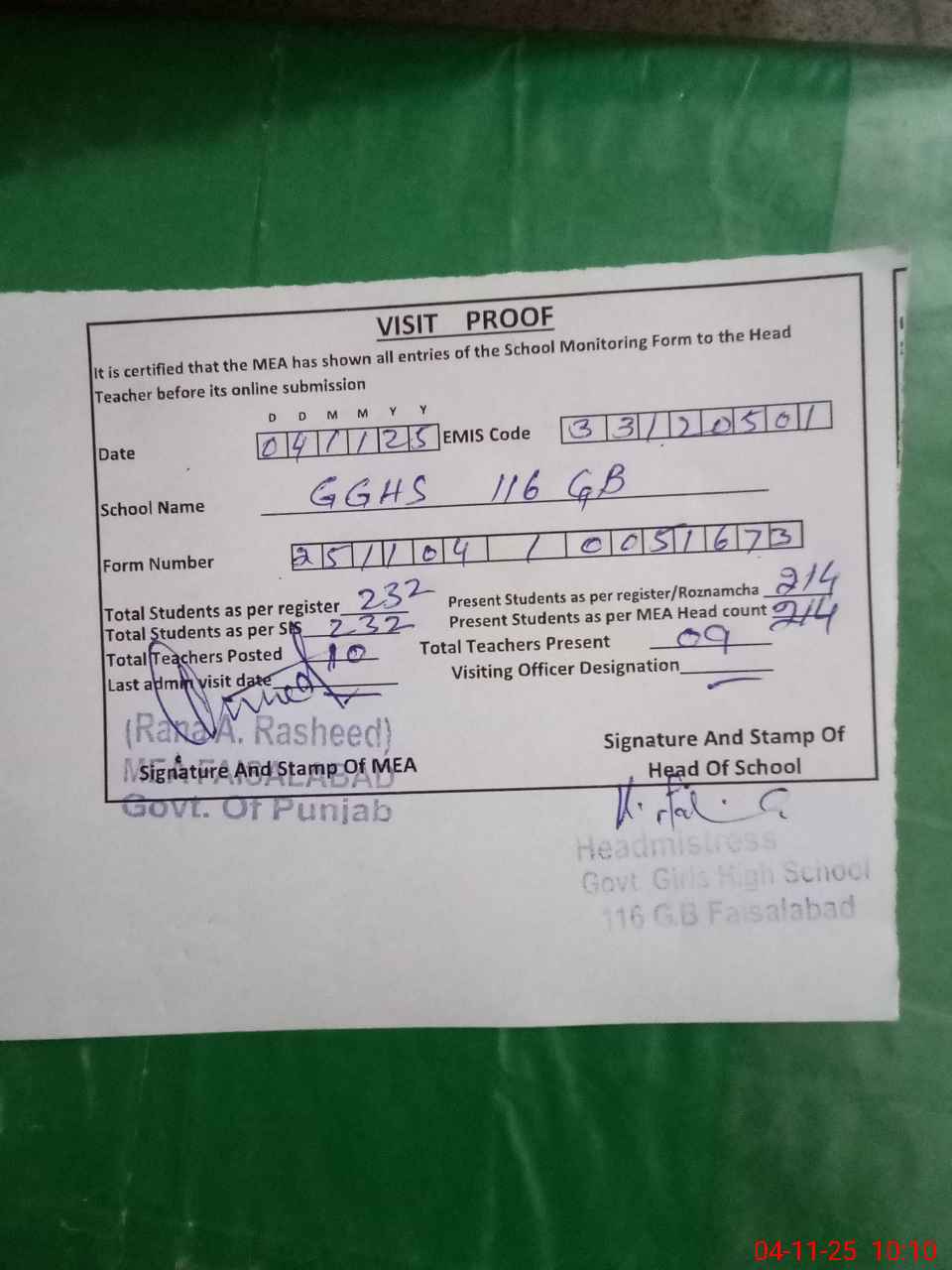 | Attendance Register | Head Teacher | MEA with School | Visit Proof |