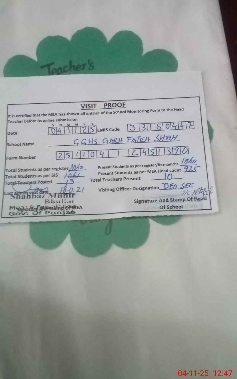 | EMIS Code: 33160447 | Name of School: GGHS GARH FATEH SHAH FSD | |||