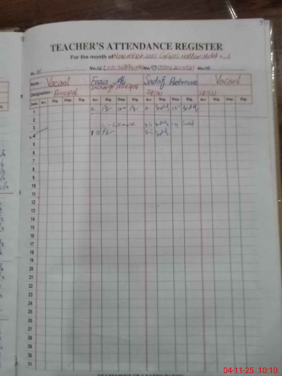 | CNIC | Full Name | Designation | R/C | Absence During Last Calender Month |