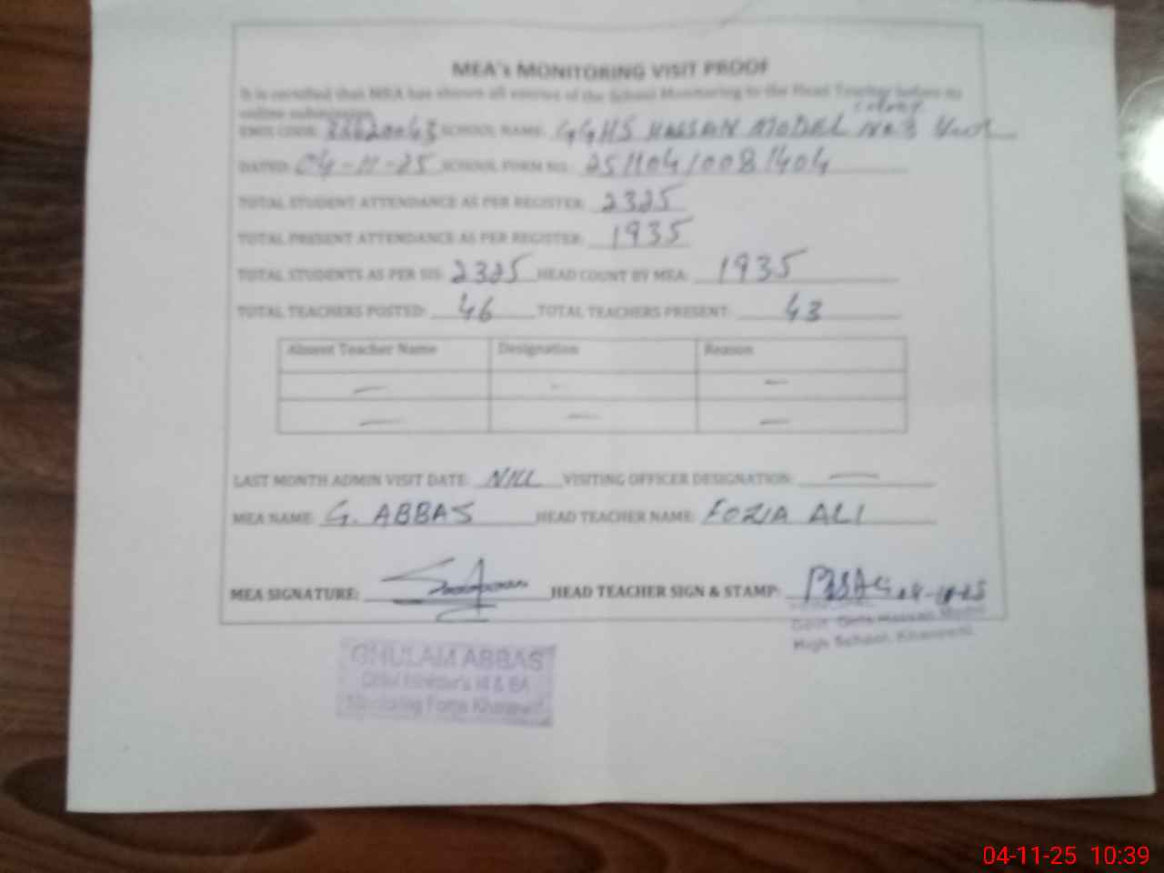 | Attendance Register | Head Teacher | MEA with School | Visit Proof |