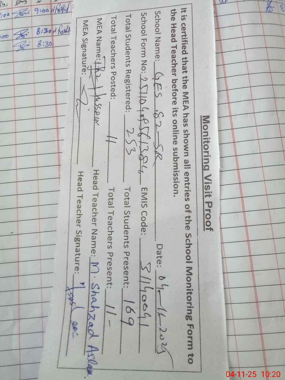 | Attendance Register | Head Teacher | MEA with School | Visit Proof |