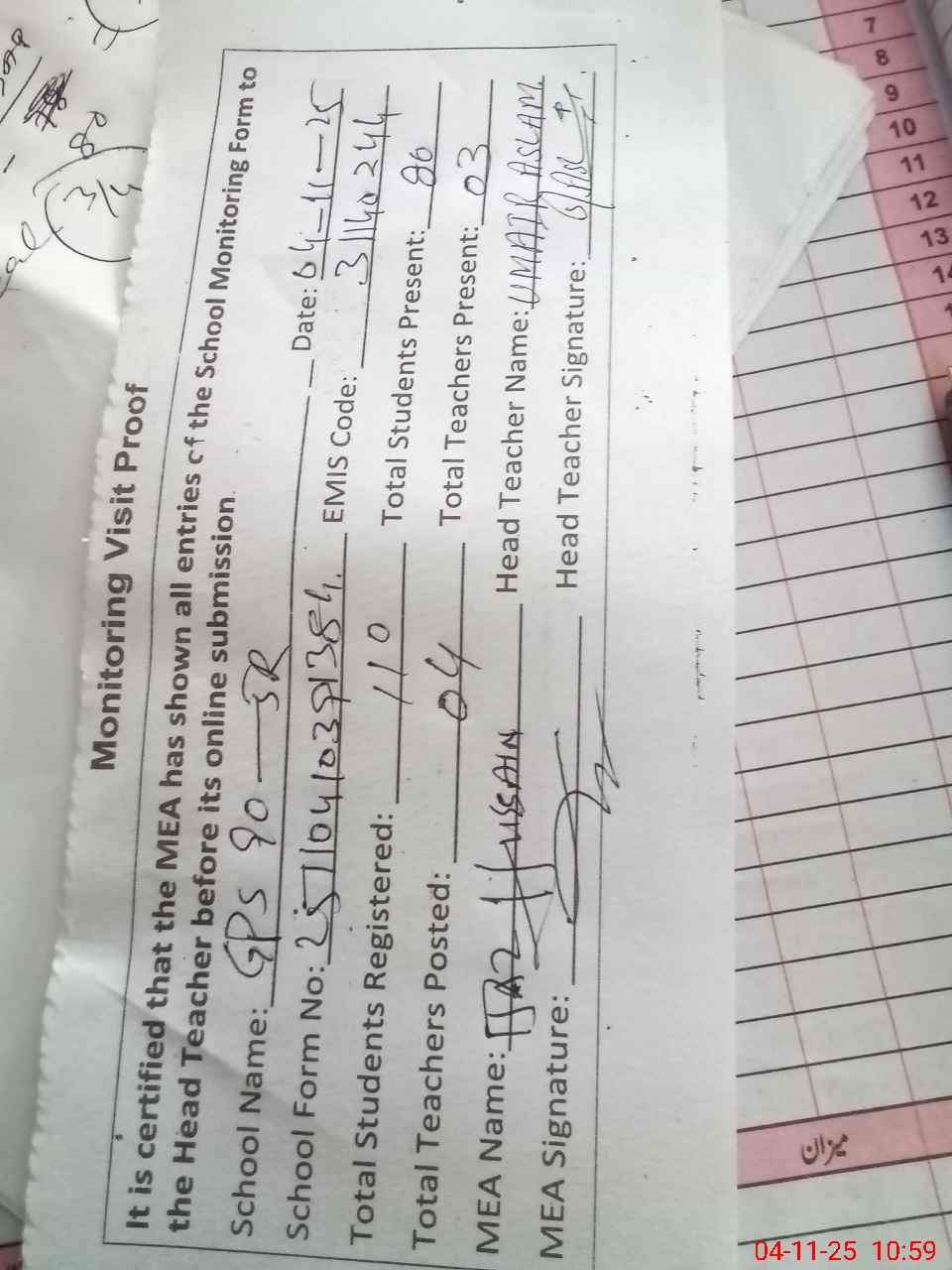 | Attendance Register | Head Teacher | MEA with School | Visit Proof |