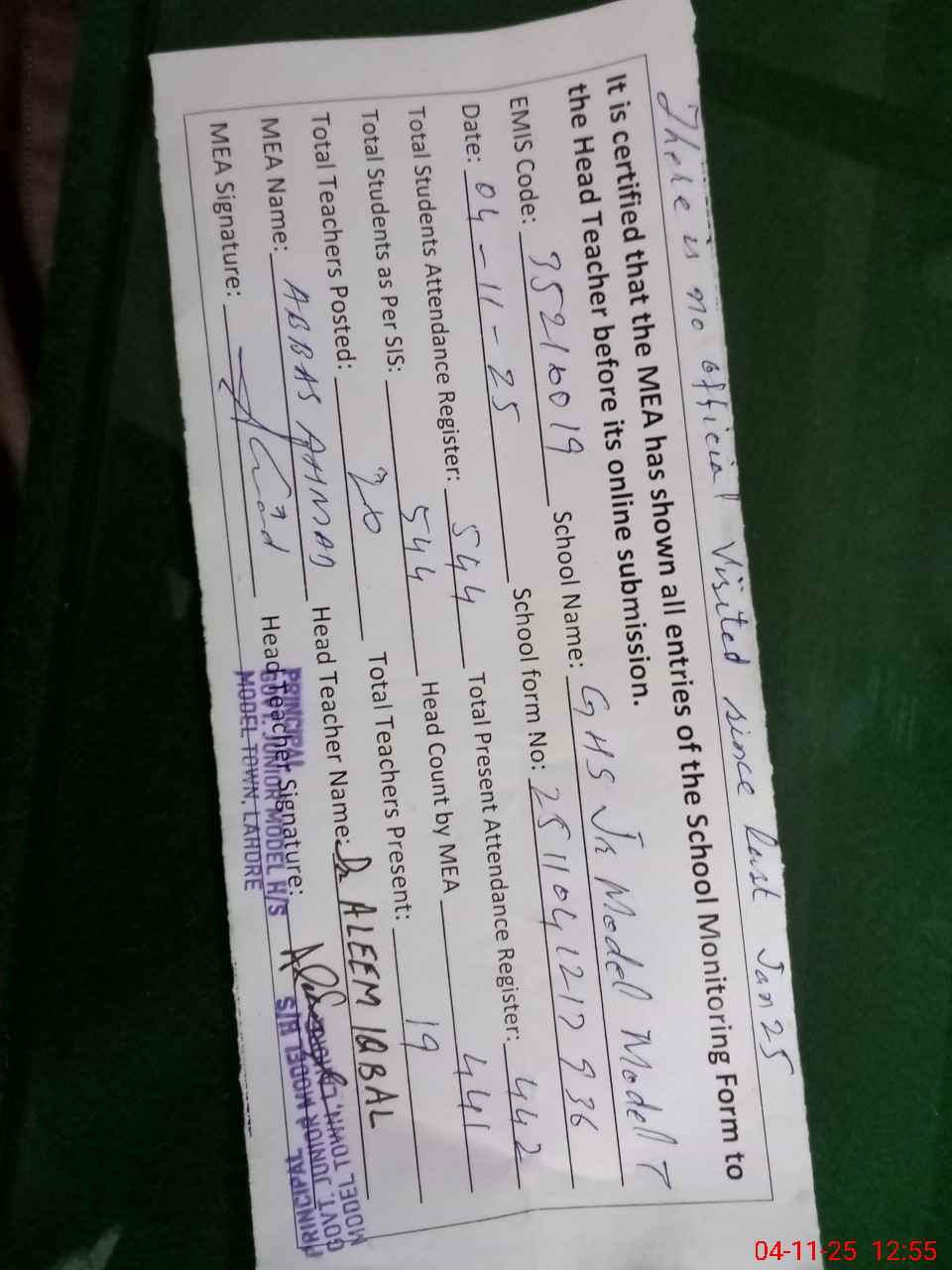 | EMIS Code: 35210019 | Name of School: GHS JUNIOR MODEL MODEL TOWN LAHORE | |||