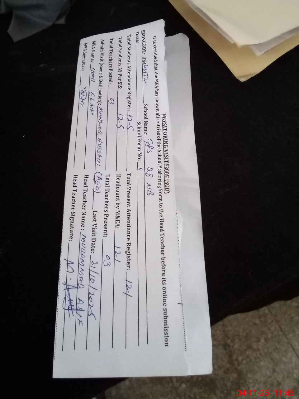 | Attendance Register | Head Teacher | MEA with School | Visit Proof |