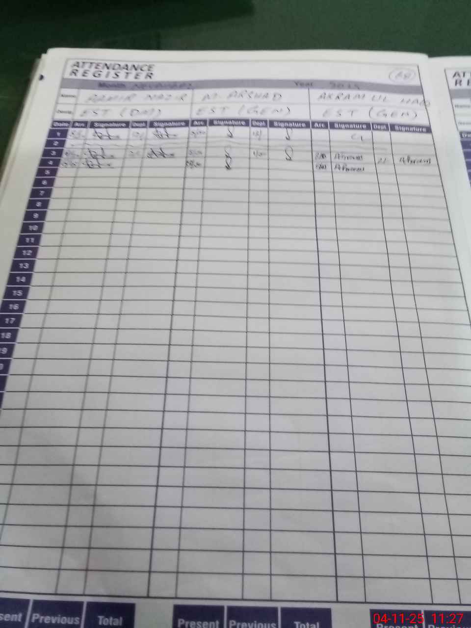 | CNIC | Full Name | Designation | R/C | Absence During Last Calender Month |