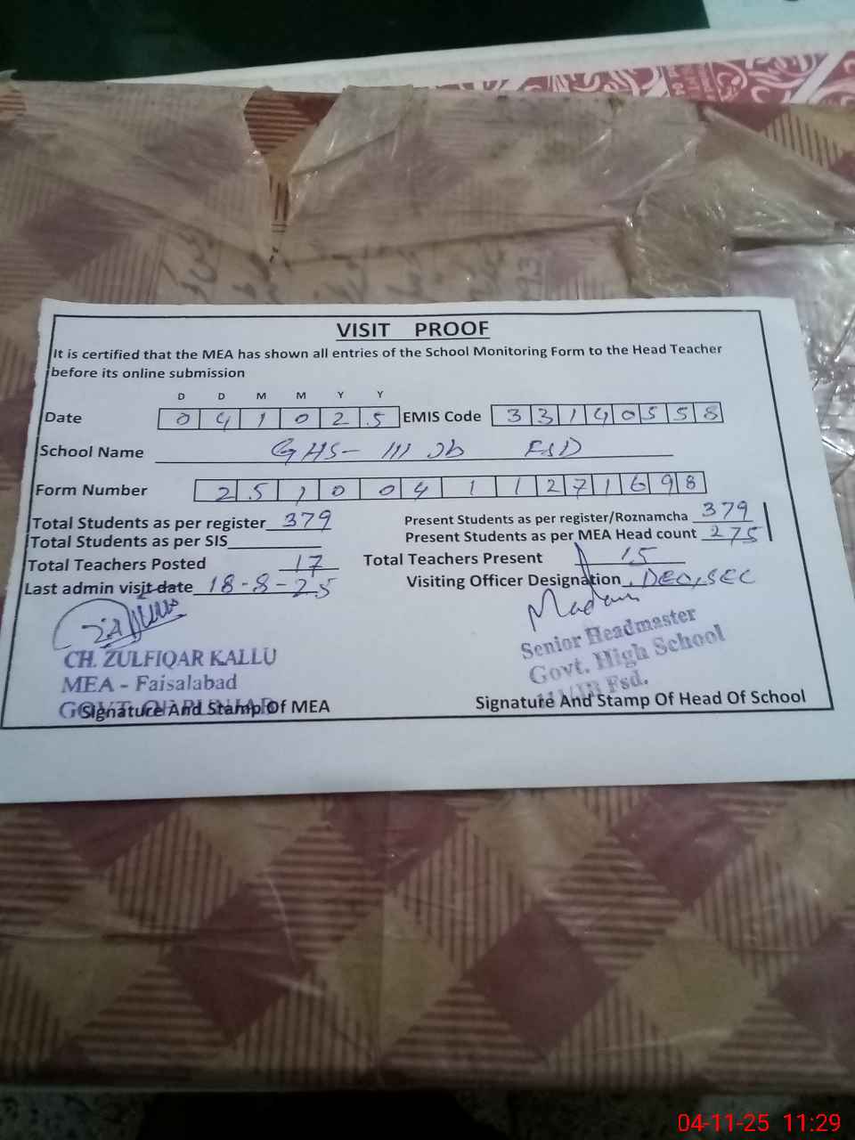 | Attendance Register | Head Teacher | MEA with School | Visit Proof |