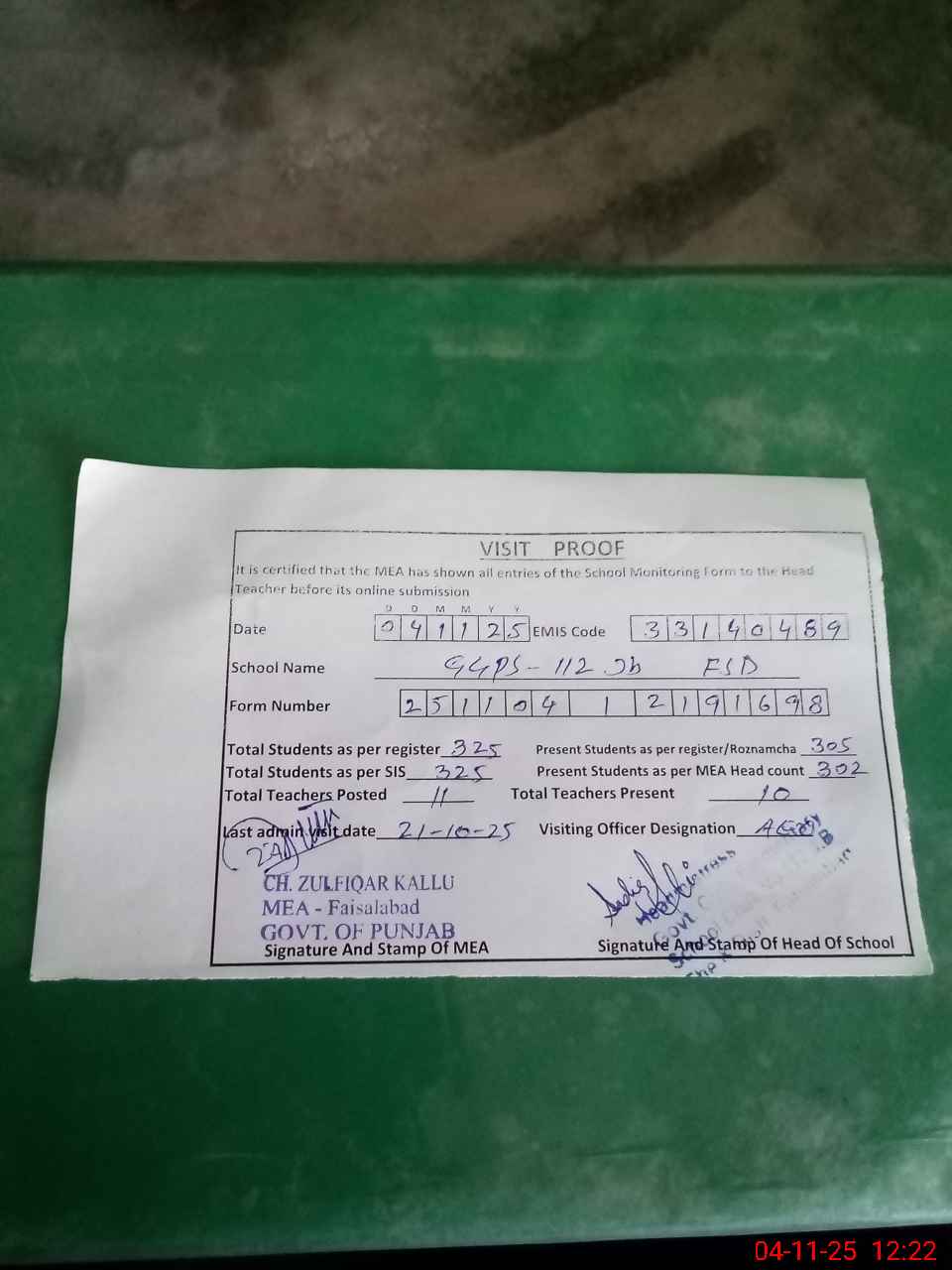 | EMIS Code: 33140489 | Name of School: GGES CHAK 112 JB | |||