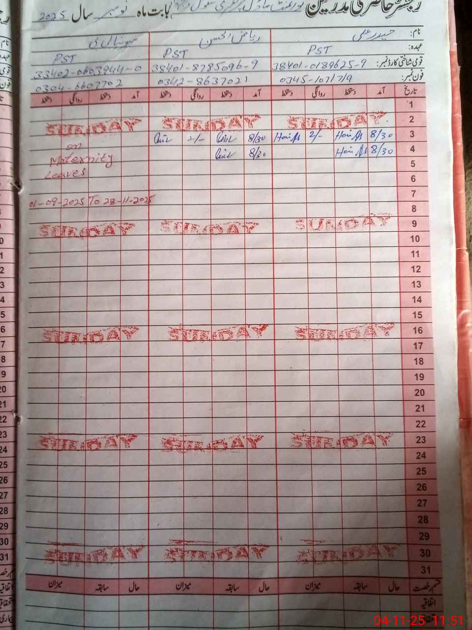 | CNIC | Full Name | Designation | R/C | Absence During Last Calender Month |