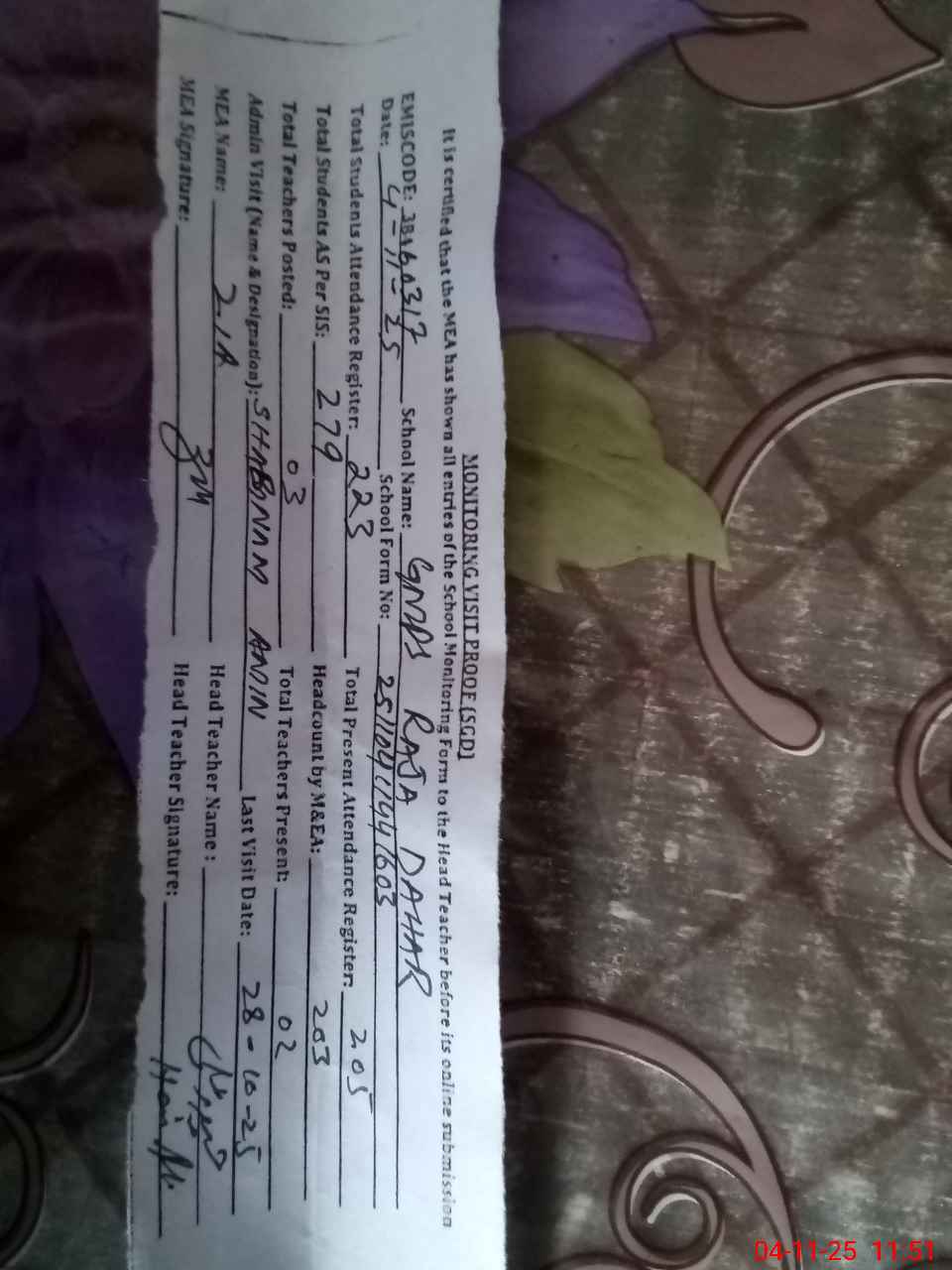 | Attendance Register | Head Teacher | MEA with School | Visit Proof |