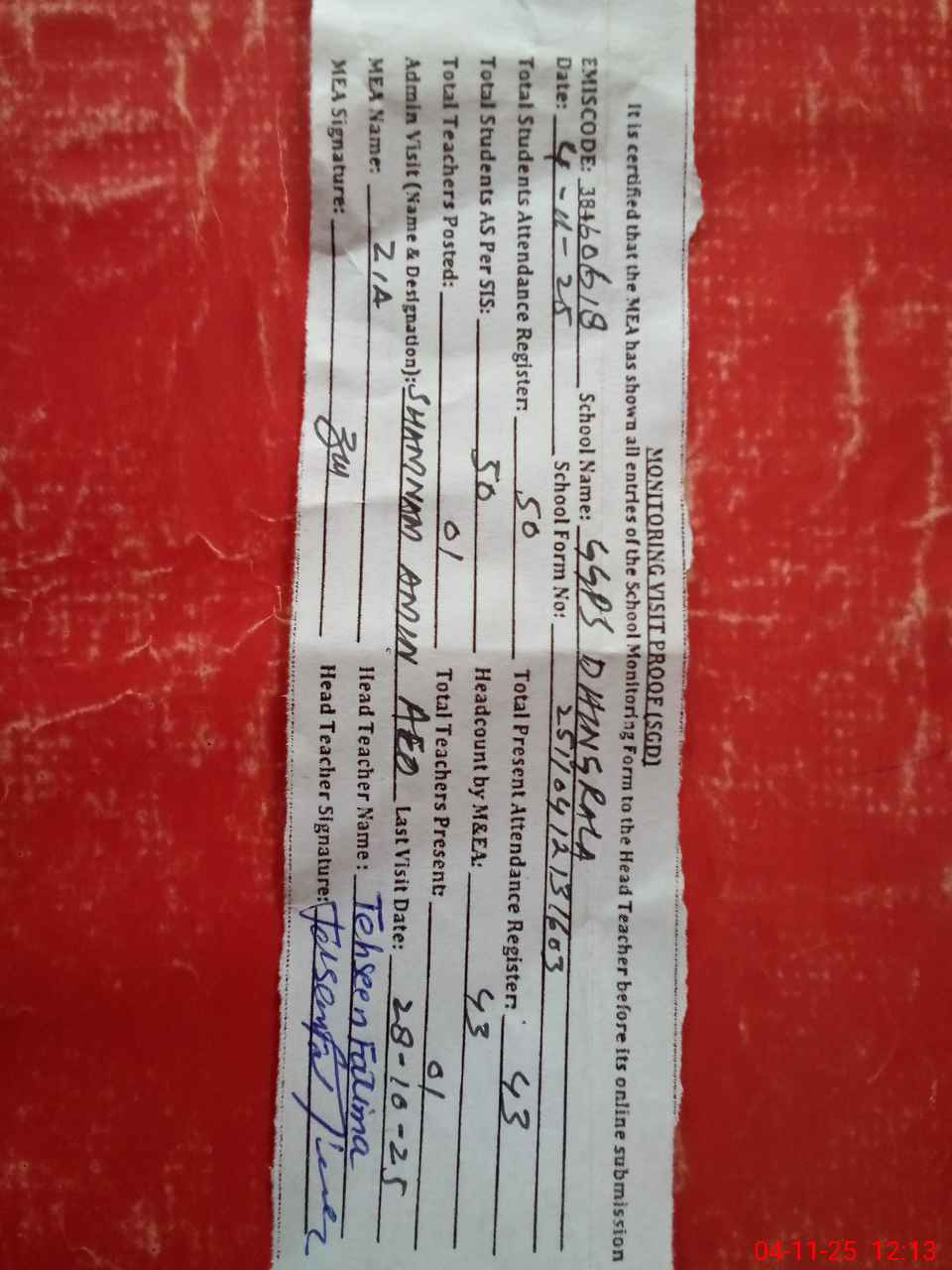 | Attendance Register | Head Teacher | MEA with School | Visit Proof |