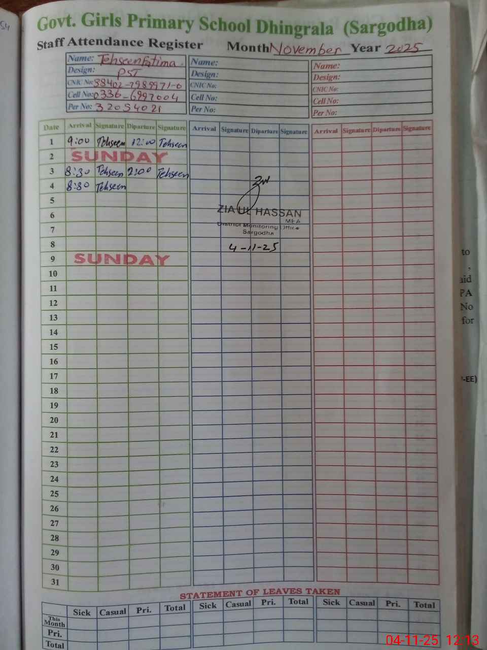 | CNIC | Full Name | Designation | R/C | Absence During Last Calender Month |