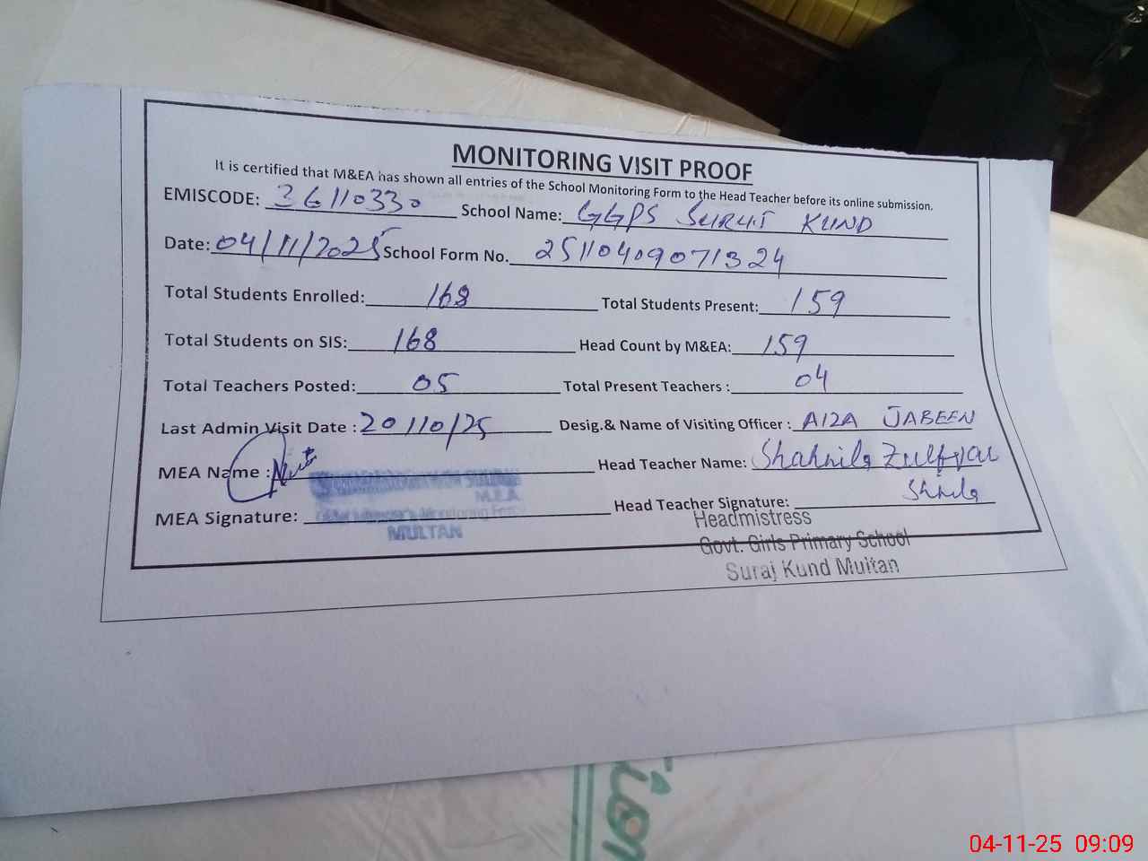 | EMIS Code: 36110330 | Name of School: GGPS SURAJ KUND MULTAN | |||