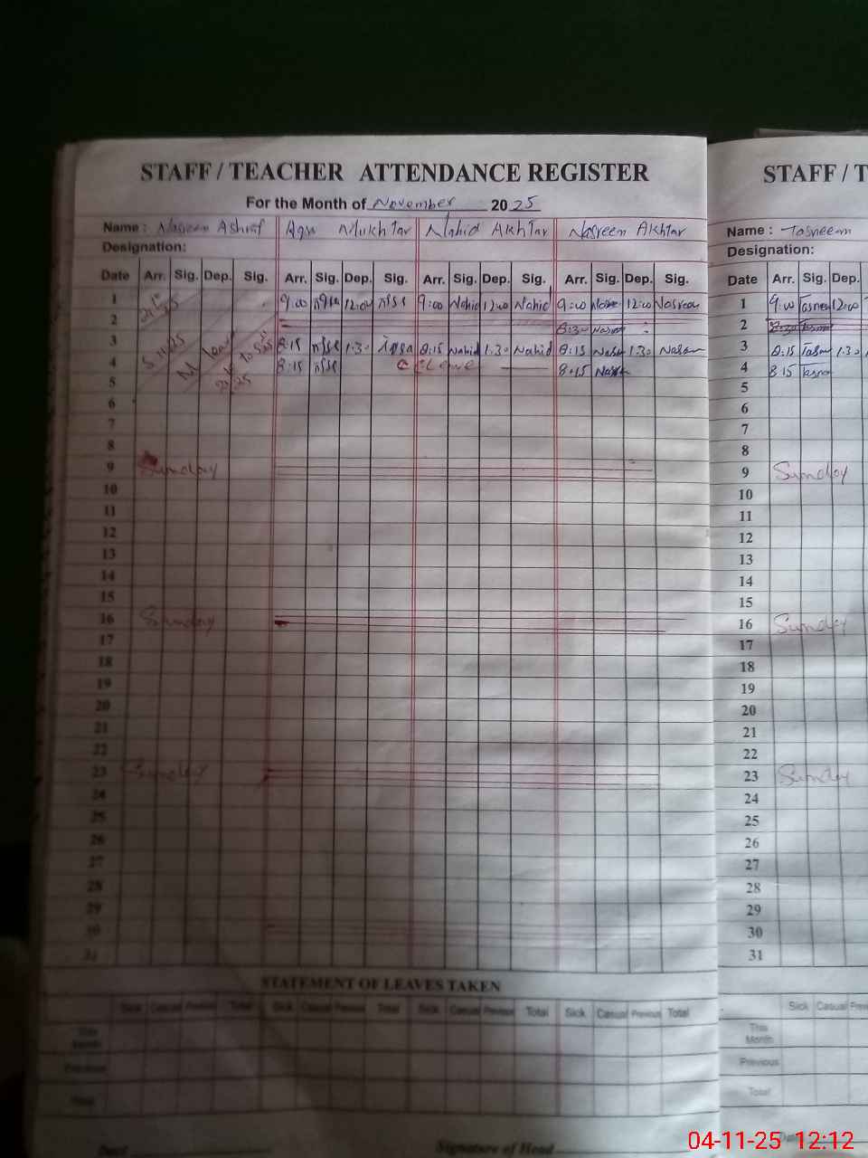 | CNIC | Full Name | Designation | R/C | Absence During Last Calender Month |