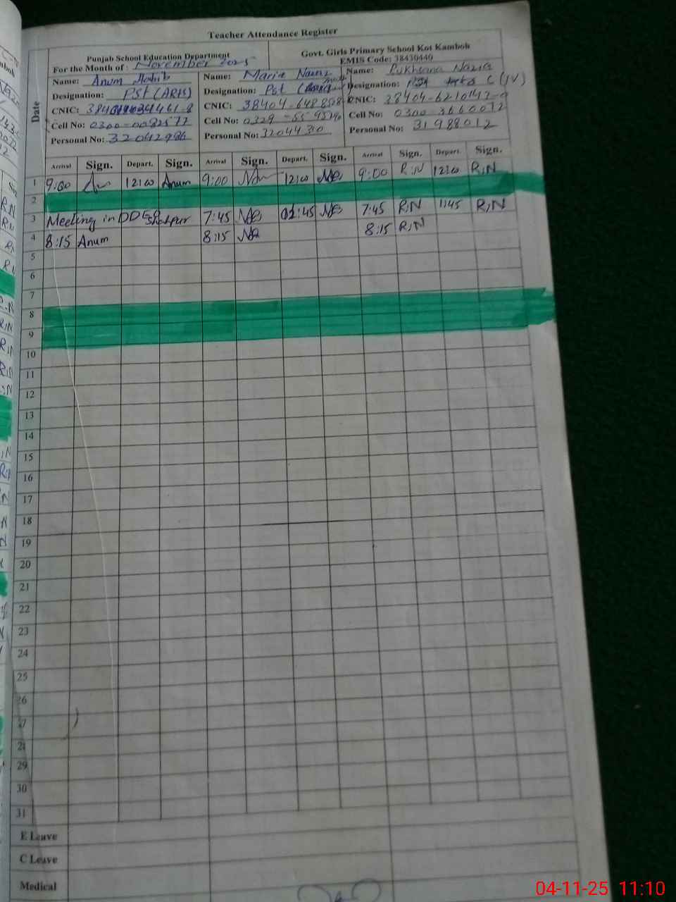 | CNIC | Full Name | Designation | R/C | Absence During Last Calender Month |