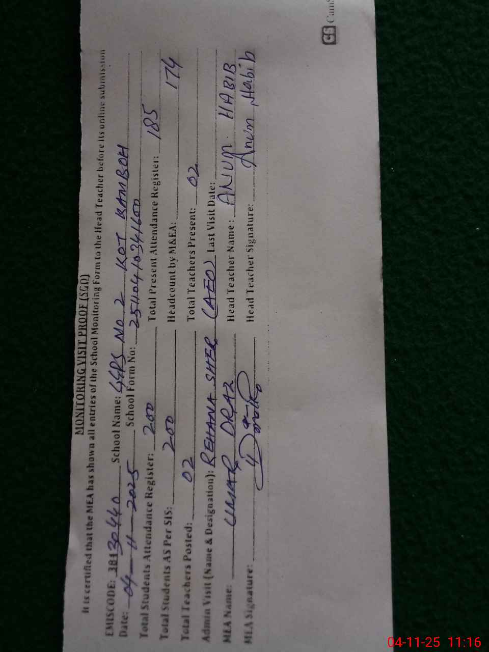 | Attendance Register | Head Teacher | MEA with School | Visit Proof |