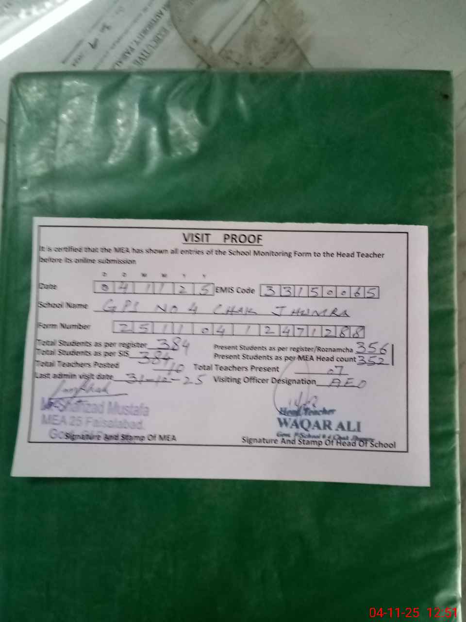 | Attendance Register | Head Teacher | MEA with School | Visit Proof |