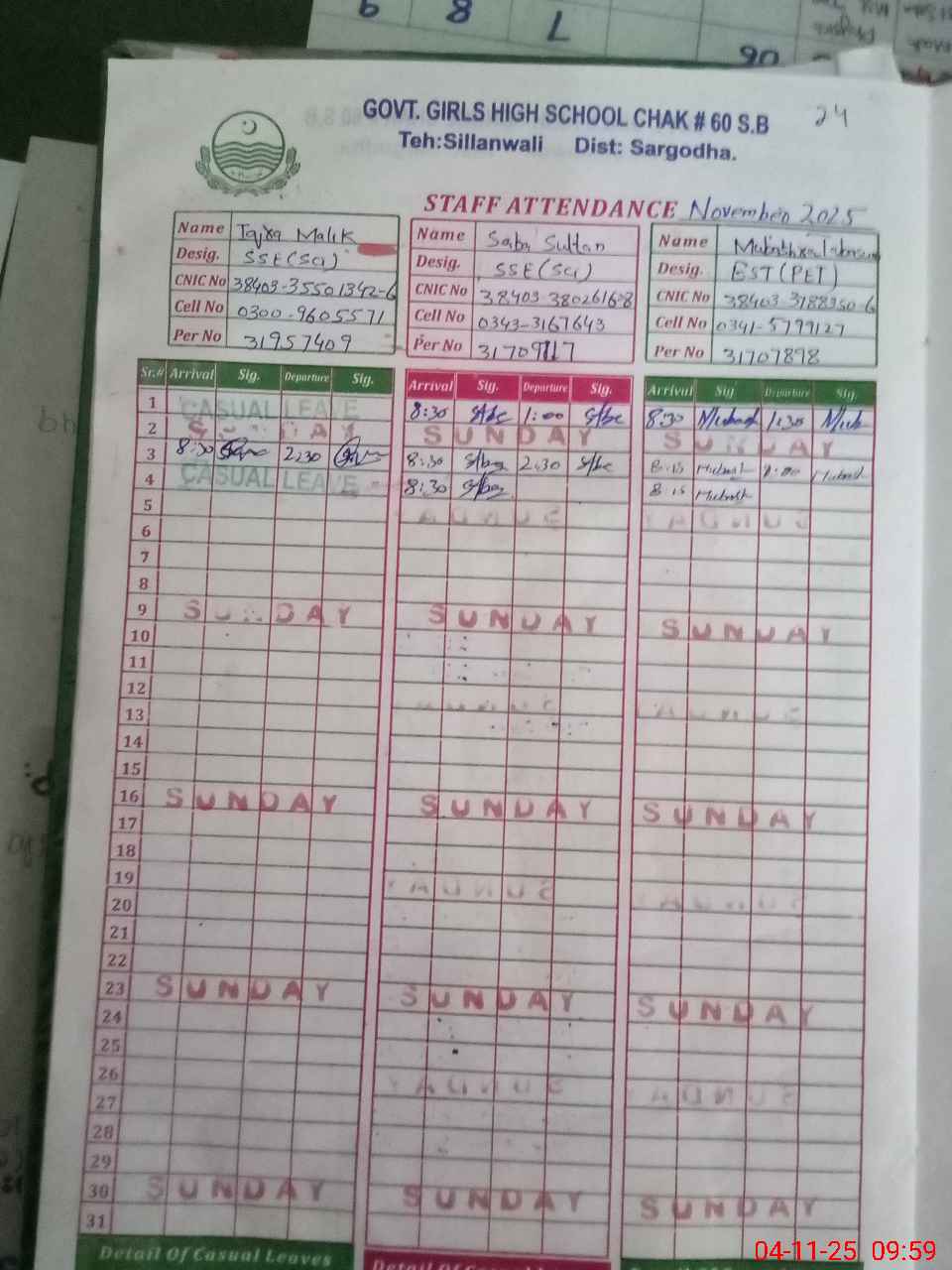 | CNIC | Full Name | Designation | R/C | Absence During Last Calender Month |