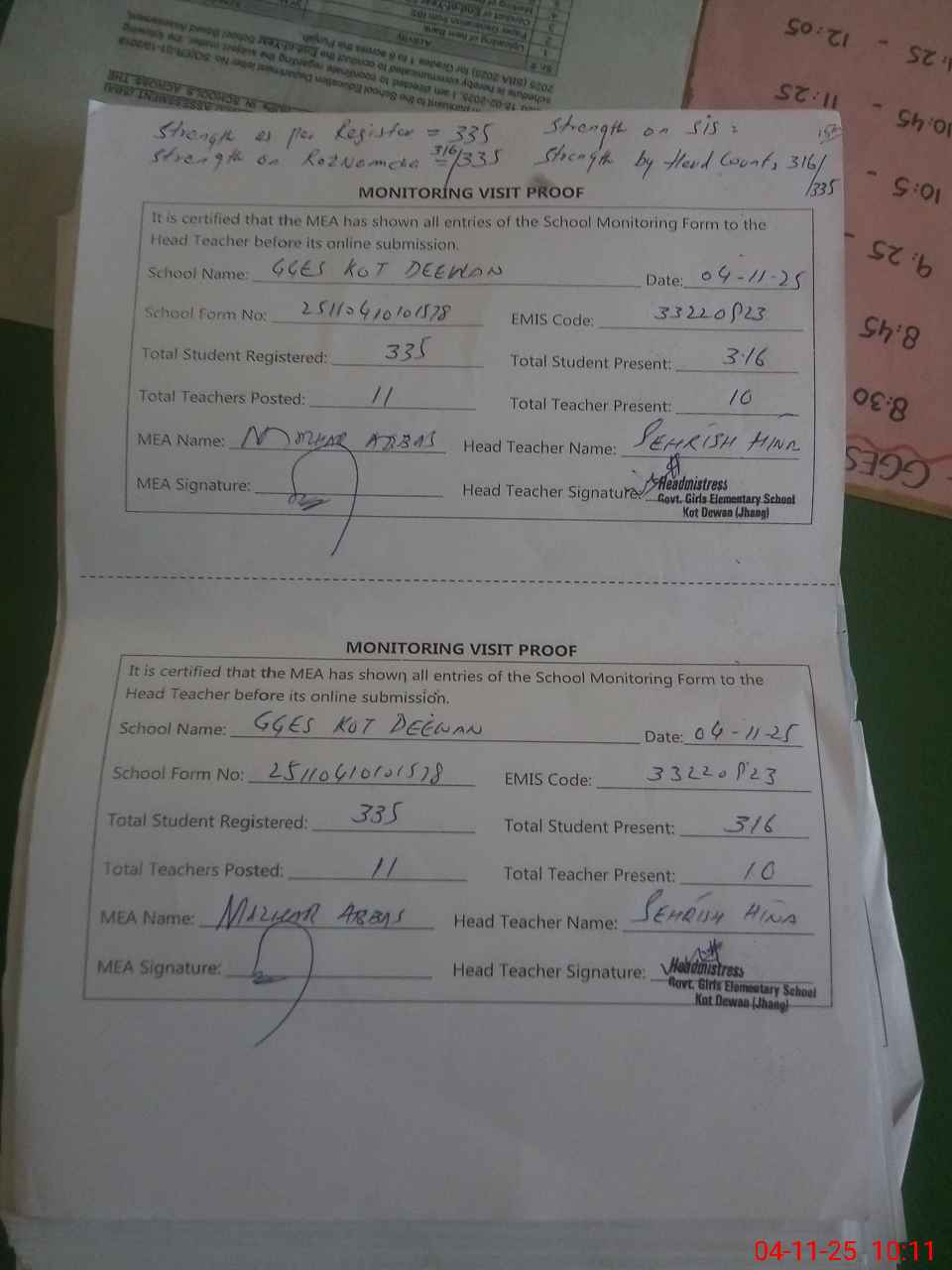 | Attendance Register | Head Teacher | MEA with School | Visit Proof |