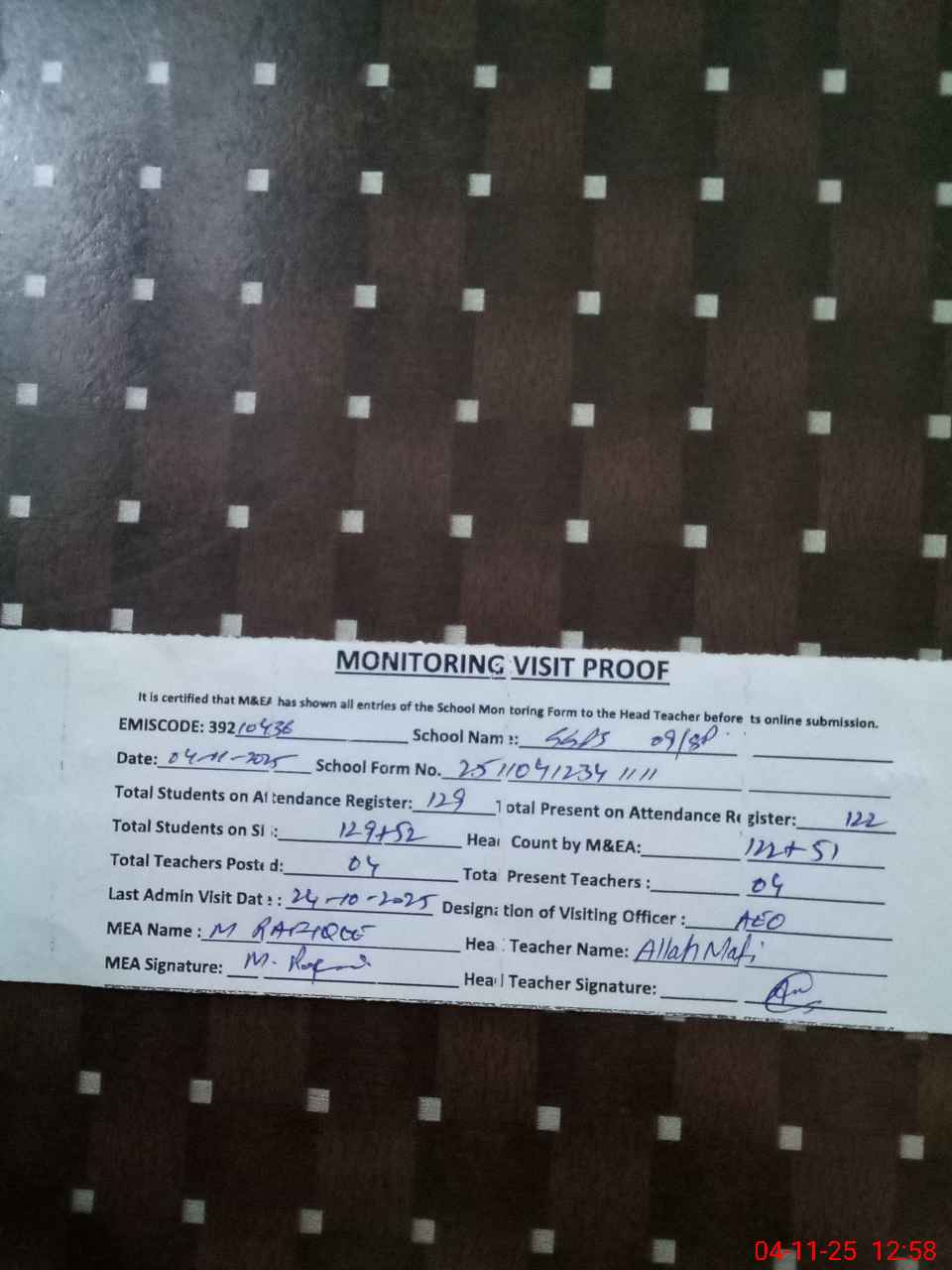 | Attendance Register | Head Teacher | MEA with School | Visit Proof |