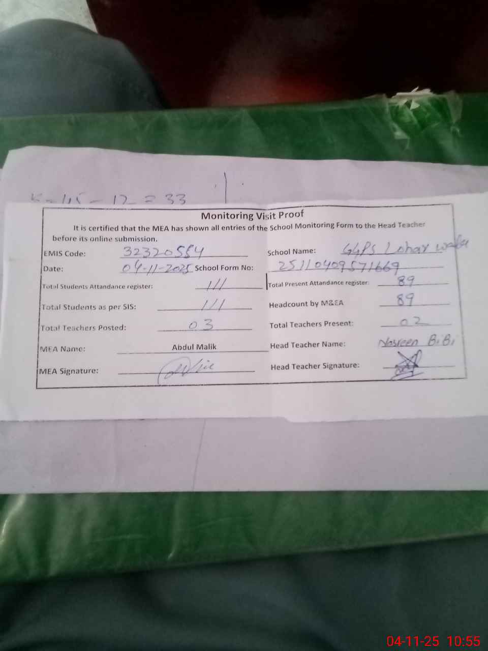 | Attendance Register | Head Teacher | MEA with School | Visit Proof |
