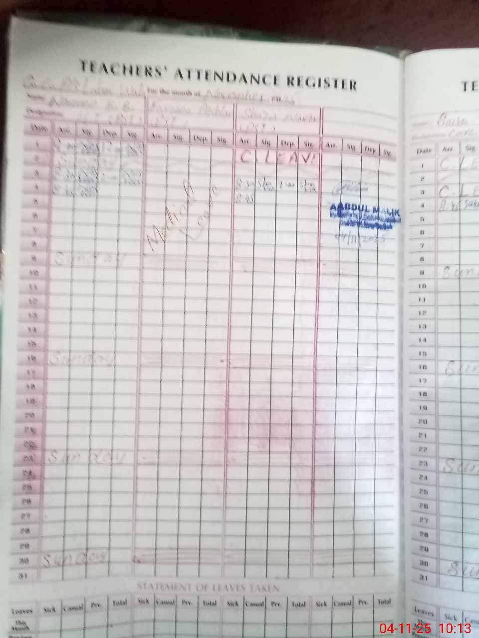 | Remarks (Use Separate Page if Required): Teacher named Farzana Akhtar her leave is rejected and she is not present at school today | |||||